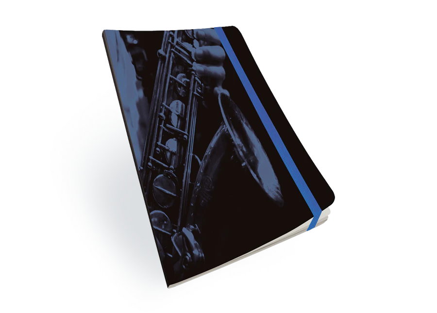 Com folhas brancas, flexível e com fecho elástico.