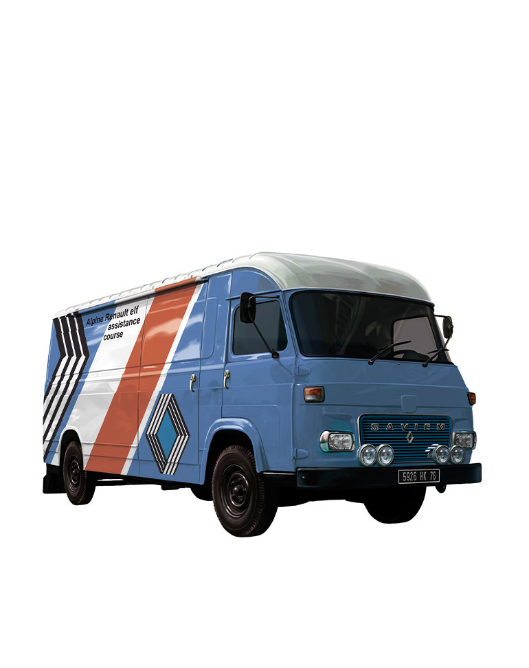 Nascida em 1959 com 850 cm3, a Estafette era uma carrinha com motor e transmissão dianteiros. Em 1962, o bloco original foi substituído pelo 1100 dos R8 e, em 1968, pelo 1300 dos R12. Utilizada como veículo de assistência em rallies, foi submetida a todo o tipo de melhoramentos.