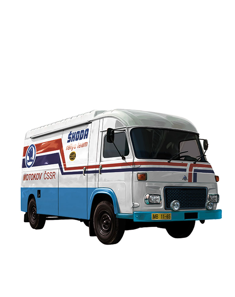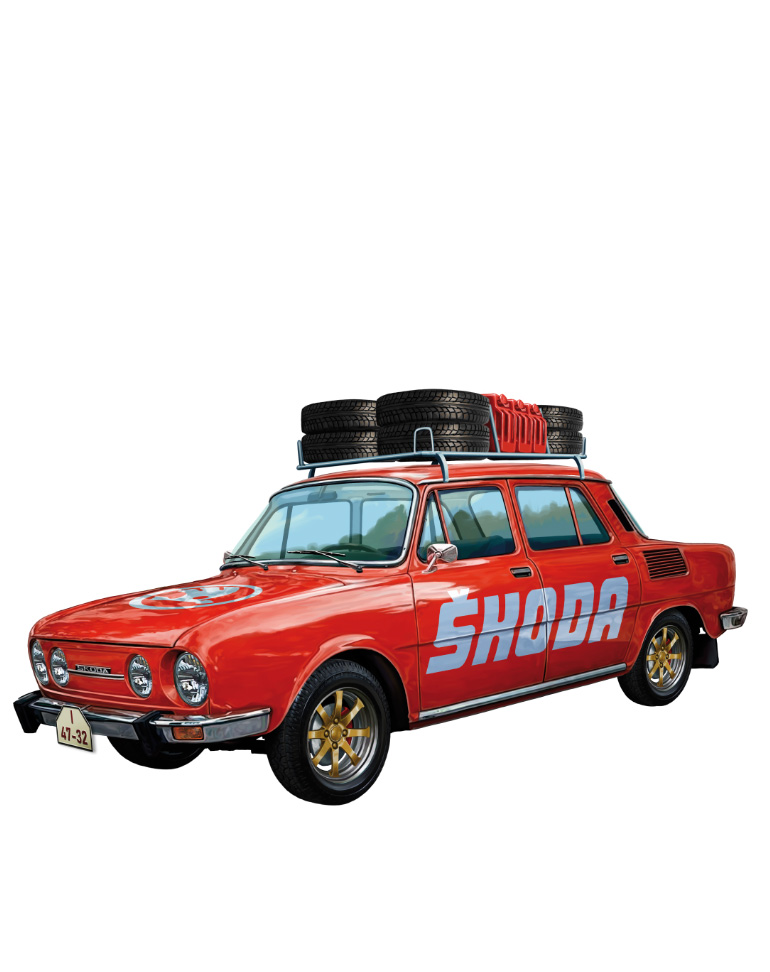 As berlinas Škoda 100/110, carros familiares por excelência, foram muito populares na Checoslováquia. Utilizaram-se para todo o tipo de tarefas, inclusivamente como veículos de assistência em rallies.